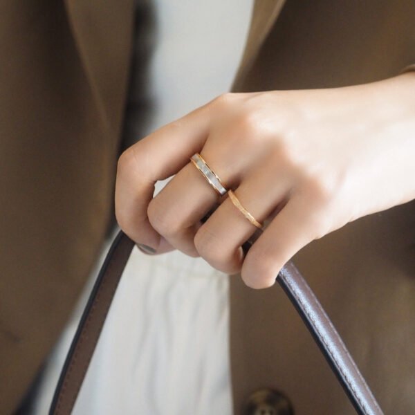 Our?Adaliz Shell Ring is an elegant ring for any finger. It features a band of shell forming a band all the way around the ring then overlaid with a clear coating for protection. Minimalist and elegant. this ring would is subtle enough for everyday wear.