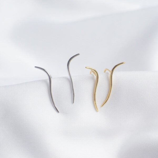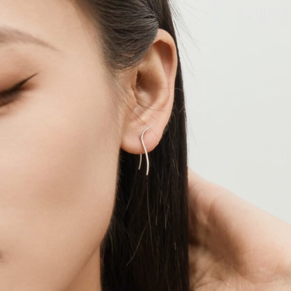 Our Midge Minimalist Line Earrings dangles to a finely curved. thin line against your ear. A simple yet powerful design that has become an indispensable classic. The earrings are lovely on their own. but can also complete an exciting and edgy look. Available in gold and silver-tone.